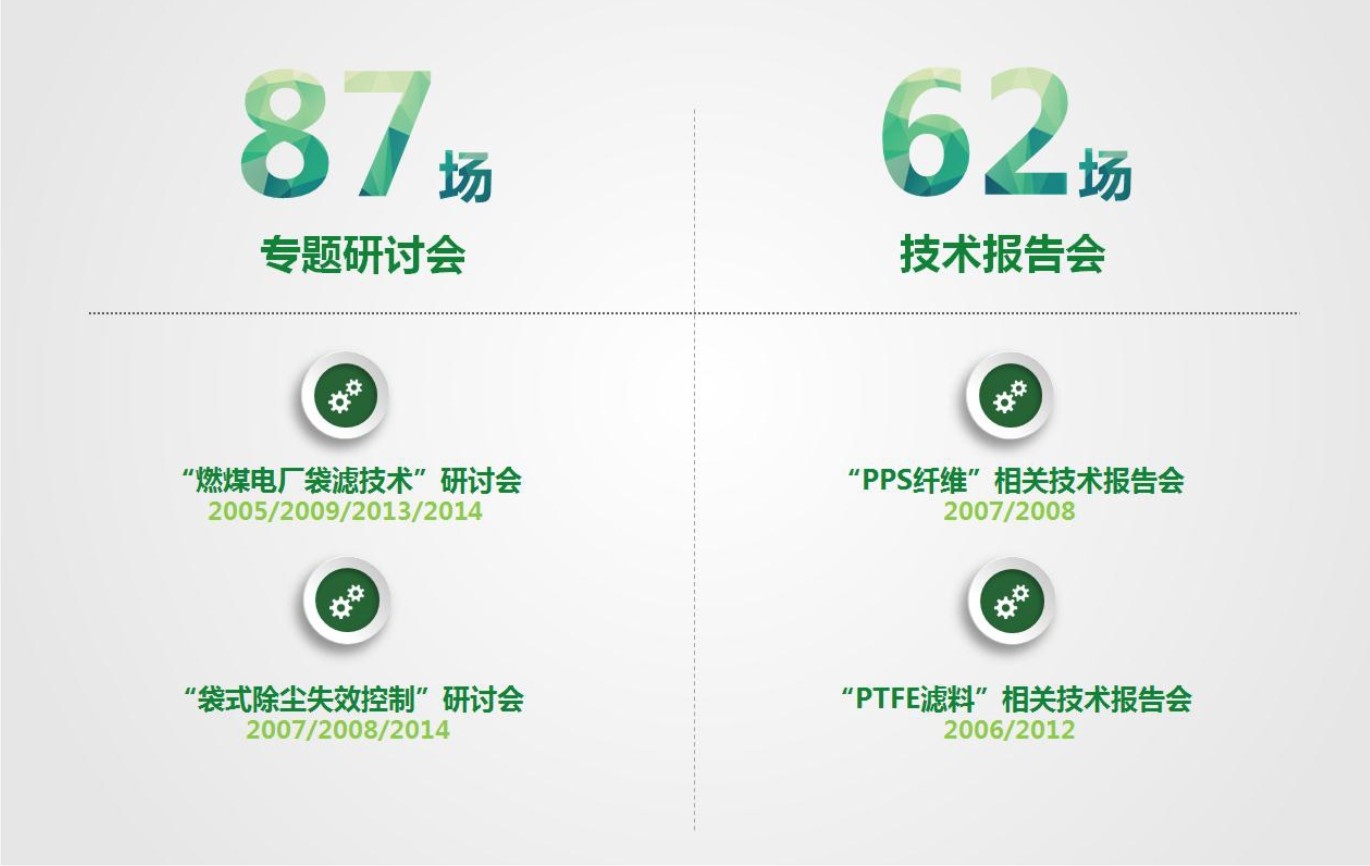 圍繞業內共同關心的技術和應用領域的熱點,適時推出專題研討會:“燃煤電廠袋濾技術研討會”(2005年/2009年/2013年/2014年)、“城市生活垃圾袋濾技術研討會”(2008年/2010年)和“袋濾技術失效控制研討會”(2007年/2008年)等各種行業專題研討會累計舉辦87場報告。