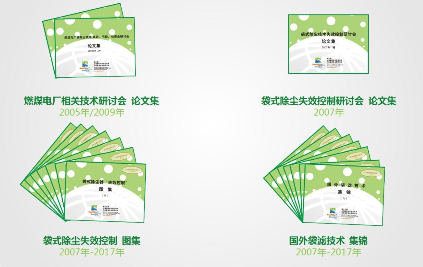 國內袋濾領域專家編篡的各類技術資料系統地歸納袋濾技術的發展和最新趨勢:《袋濾技術失效控制圖集1/2》(2007年/2017年),《國外袋濾技術集錦1/2》(2008年/2017年),以及展覽期間的專題研討會和技術報告會光盤。