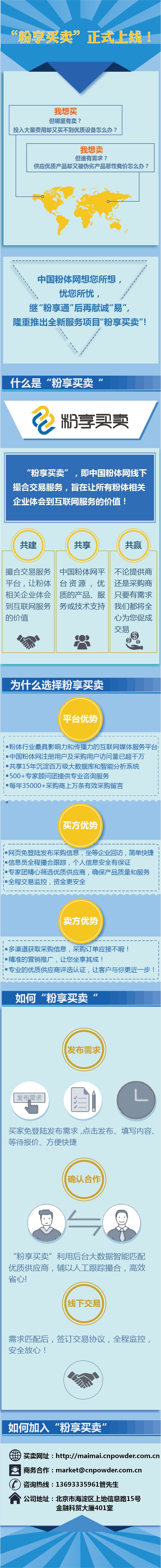 2017年5月11日,中國粉體網(wǎng)線下撮合交易服務(wù)“粉享買賣”正式上線。粉享買賣利用信息化手段整合優(yōu)勢(shì)資源,降低運(yùn)輸成本,一站式委托,保姆式服務(wù),讓您切實(shí)體會(huì)到互聯(lián)網(wǎng)服務(wù)的價(jià)值!粉體產(chǎn)業(yè)鏈交易,就找粉享買賣!給我誠心,還您誠“易“!