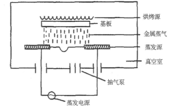 蒸發鍍膜法是在0.13Pa真空度中進行,用電阻蒸發源或電子束加熱蒸發,使鋁、銅成為氣相原子或分子然后沉積到陶瓷基體上,下圖為其工作示意圖。真空蒸鍍銀銅是一種清潔工藝,以日本村田、京陶公司為代表的國際著名電陶企業,在本世紀初開始采用單機式真空蒸發技術進行金屬化。但是金屬膜層與陶瓷的結合力較差,容易造成吸銀銅或電極早期脫落,而且金屬膜層的厚度不易控制、均勻度與一致性差、材料利用率較低。