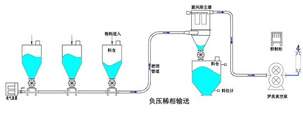 稀相負壓輸送的特點是可以從一點或散裝處多點向高處一點進行物料輸送。
