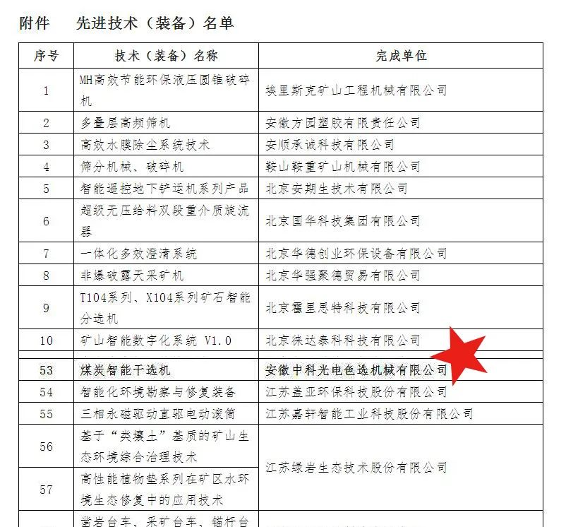 此次入選綠色礦山技術裝備形式審查合格名錄的煤炭智能干選機,先后榮獲中國煤炭工業協會科學技術獎一等獎、上榜全省工業領域節能環保“五個一百”推介目錄、入選2021年安徽省首臺套重大技術裝備名單、榮列2021年安徽省新產品名單等榮譽,在“雙碳”背景下為選煤行業的發展帶來新的機遇,提供了更多智能化解決方案。