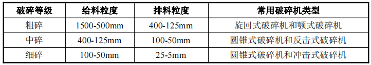 從破碎原理角度看,破碎設備的原理有擠壓、剪切、沖擊等多種方式;根據原理的不同可分為旋回破碎機、顎式破碎機、圓錐式破碎機、沖擊式破碎機等。從作業工段角度看,由于不同的下游應用場景對于物料的粒度有不同的要求,物料往往需要經歷粗碎、中碎、細碎三個等級的破碎過程后達到不同行業對粒度的要求,不同破碎等級所采用的破碎機類型往往也有區分。