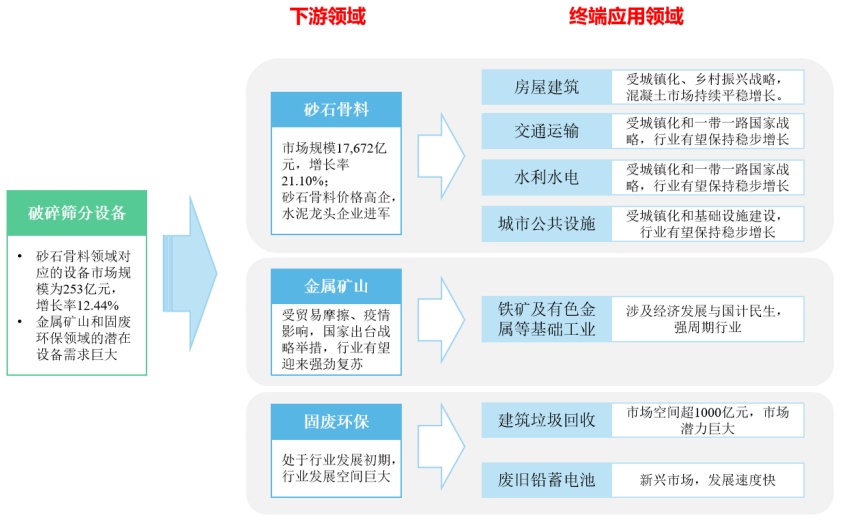 破碎、篩分設備下游應用領域較為廣泛,目前主要有砂石骨料、金屬礦山和固廢環保等三大直接應用領域,最終受房屋建筑、交通運輸、水利水電、城市公共設施、鐵礦及有色金屬基礎工業、建筑垃圾回收、廢舊電池綜合利用等多個終端應用市場的綜合影響。