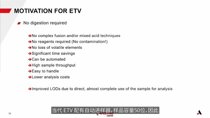 Olaf Schulz經(jīng)理在報(bào)告中對ETV-ICP-OES直接進(jìn)樣法技術(shù)進(jìn)行了介紹并展示了該技術(shù)的特色及優(yōu)點(diǎn)。他簡要講解了ICP-OES進(jìn)樣法的工藝,介紹了固體及液態(tài)樣品的引入技術(shù),以及ICP-OES法的優(yōu)勢。ETV技術(shù)在20世紀(jì)80年代被開發(fā)出來,早期該技術(shù)應(yīng)用起來非常麻煩,僅限于某些特殊領(lǐng)域,比如分析一些難以消解的材料,陶瓷和耐火材料等。過去的ETV系統(tǒng)必須手動(dòng)操作,經(jīng)過技術(shù)迭代,現(xiàn)代的ETV配有自動(dòng)進(jìn)樣器,有更高的樣品通道。Olaf Schulz經(jīng)理詳細(xì)的講解了ETV-ICP-OES在石墨負(fù)極元素分析中的應(yīng)用。ETV結(jié)合ICP-OES可以成為分析石墨中微量元素的一種非??焖佟⒑唵吻铱煽康姆椒?。同時(shí),將用于數(shù)據(jù)評估的ICPAnalyzerPro儀器軟件與之集成使用,可以大大簡化工作流程。由于ETV-ICP-OES以較低的成本提供了性價(jià)比較高的檢測技術(shù),因而它在實(shí)際應(yīng)用中具備很強(qiáng)的技術(shù)競爭力。