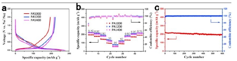如圖2所示,有研究者在1200℃下一步熱解無(wú)煙煤,制備了無(wú)煙煤基炭材料,在0.03A/g電流密度下具有222mAh/g的可逆比容量和穩(wěn)定的儲(chǔ)鈉循環(huán)性能,并已將其應(yīng)用于低速電動(dòng)車(chē),實(shí)現(xiàn)規(guī)模化制備。