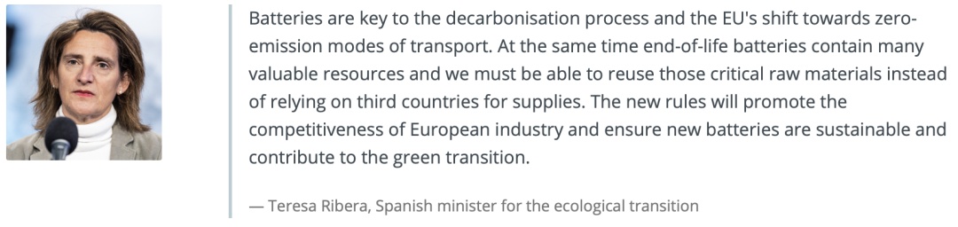西班牙生態轉型部長特雷莎·里韋拉(TeresaRibera)表示,“電池是歐盟脫碳進程和向零排放運輸方式轉變的關鍵。與此同時,報廢電池包含許多寶貴的資源,我們必須能夠重新利用這些關鍵的原材料,而不是依賴第三國的供應。新規定將促進歐洲工業的競爭力,確保新電池是可持續的,并有助于綠色轉型。”