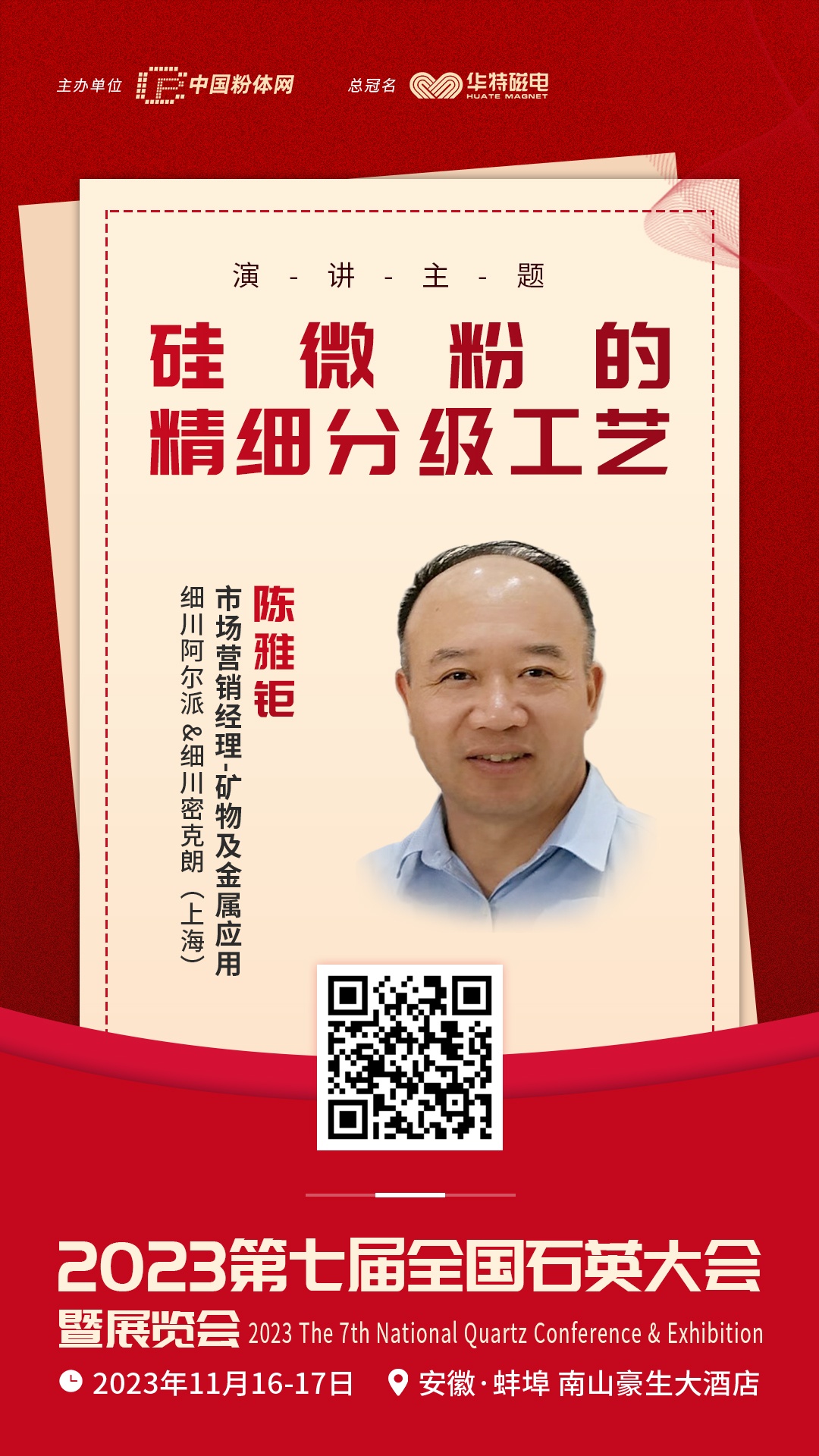 由中國粉體網主辦的“2023(第七屆)全國石英大會暨展覽會”即將于11月16~17日在安徽蚌埠召開,屆時,細川阿爾派 金屬及礦業業務 市場營銷經理陳雅鉅將帶來題為《硅微粉的精細分級工藝》的報告,為大家分享全球頂尖粉體裝備技術工藝的最新進展。