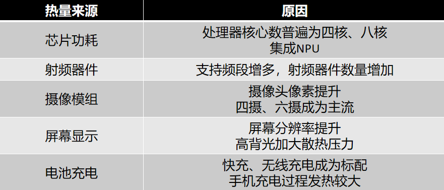 5G網(wǎng)絡(luò)下,手機高散熱需求的原因可概括為以下兩點:一是5G網(wǎng)絡(luò)的高網(wǎng)速、高頻率,使手機得以在同等時間內(nèi)實現(xiàn)更高頻次的數(shù)據(jù)傳輸;二是MIMO天線技術(shù)的應(yīng)用使得手機需要內(nèi)置更多天線,在Sub-6Ghz頻段約需要8-10根天線,在毫米波頻段需要10-12根天線,功耗及發(fā)熱也隨之增加。手機的熱量來源主要分為以下幾個模塊:
