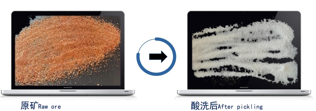 (1)石英砂酸洗前沒有磁選工藝,酸洗后還有部分機械鐵殘留在石英砂中,機械鐵迅速氧化,導致石英砂直接變成黃色;
