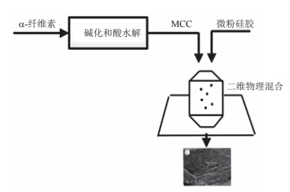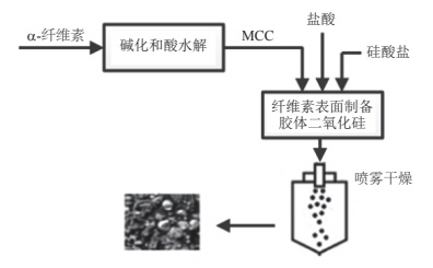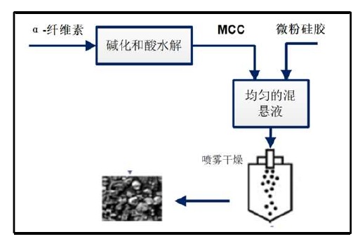 大多商業(yè)化的SMCC采用將微晶纖維素和膠體二氧化硅的懸濁液經(jīng)噴霧干燥的方式生產(chǎn),其制備流程如下。
