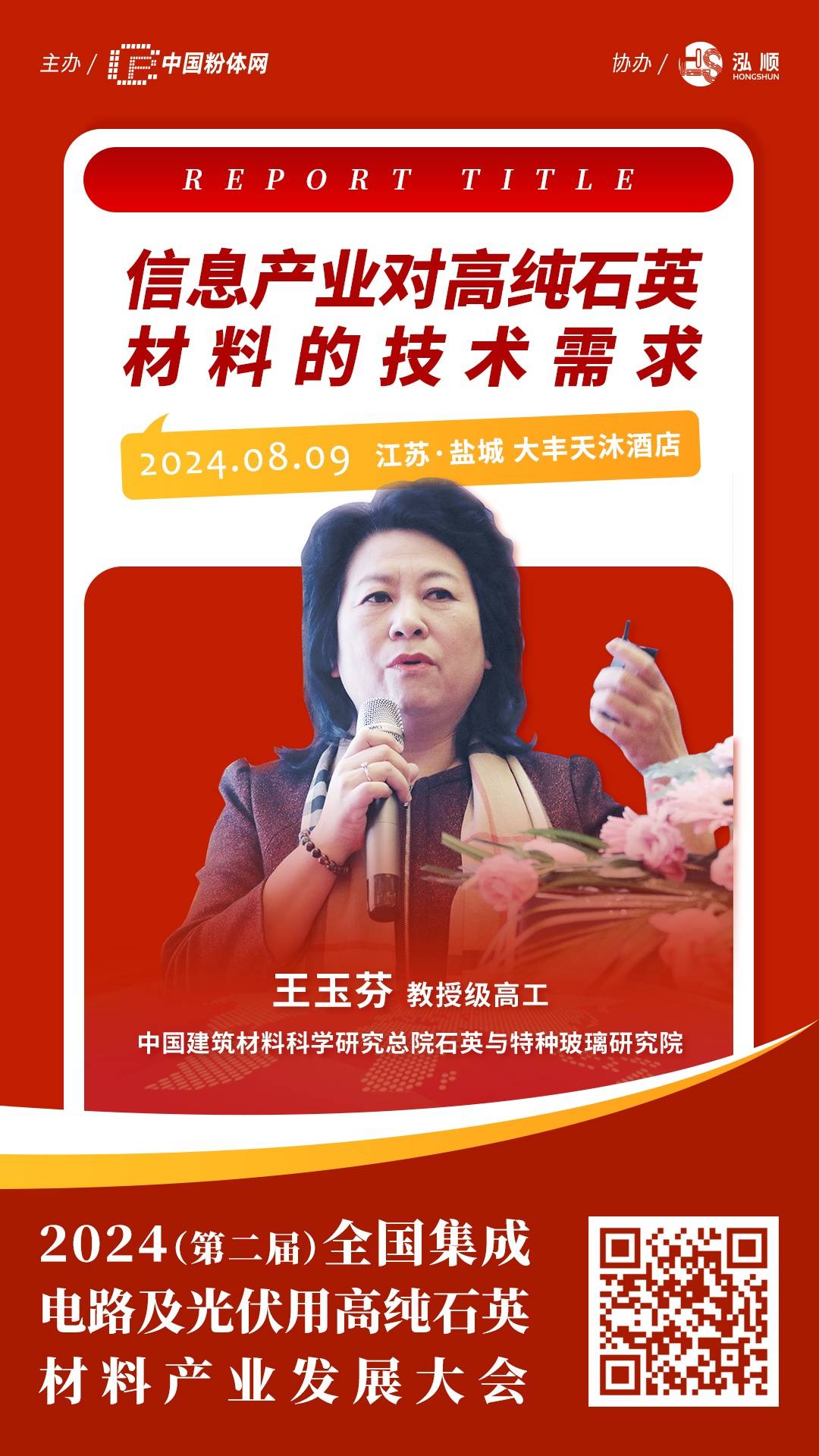 2024年8月9日,中國粉體網將在江蘇鹽城大豐天沐酒店舉辦“2024(第二屆)全國集成電路及光伏用高純石英材料產業發展大會”,屆時,來自中國建筑材料科學研究總院石英與特種玻璃研究院的教授級高工王玉芬將作《信息產業對高純石英材料的技術需求》報告。