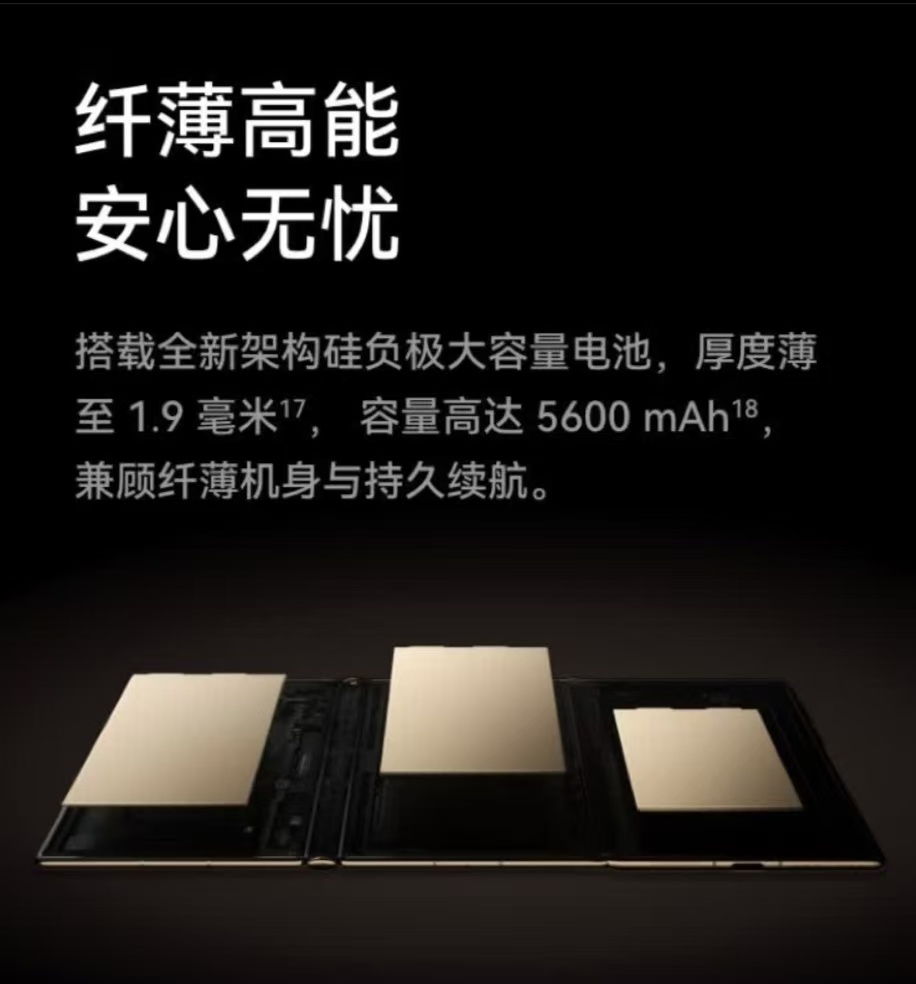 硅碳負極電池體積小、輕薄的特點使其非常適用于折疊屏手機等電子設備。在硅碳負極電池出現之前,若想實現更高的續航,往往采用堆積電池的方式,拿體積換容量。而當需要給其他配置騰空間時,又不得已犧牲電池容量。硅碳負極電池的出現改變了這一局面,它可以大幅減小體積,使手機更加輕薄。例如,華為發布的全球商用三折折疊屏手機Mate XT,采用全新架構硅負極大容量電池,厚度壓縮至1.9毫米,容量卻能達到5600mAh。這為其他器件提供了更多空間,比如影像模組。同時,也使得折疊屏手機在保證續航的同時,越來越輕薄。