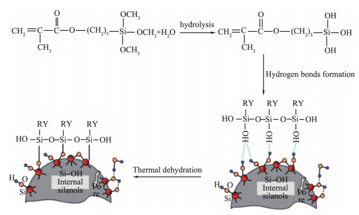 濕法改性是指在液相條件下對硅微粉表面進行潤濕,降低表面的結合能,然后加入一定量的表面改性劑和助劑,在一定溫度下攪拌分散,實現硅微粉的表面改性。濕法改性工藝能使硅微粉與改性劑更容易分散并更加充分的結合,改性更均勻,但后續需要脫水作業,工藝流程復雜且能耗高,更適合粒徑小于5μm的超細硅微粉改性。此外,濕法改性過程中還應考慮改性劑的水溶性,因為只有水溶性較好的改性劑才能更好地分散并與硅微粉表面Si—OH基作用。