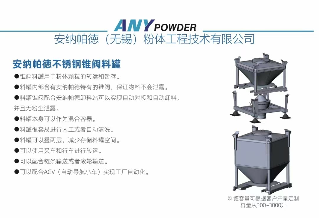 潘總:安納帕徳(無(wú)錫)粉體工程技術(shù)有限公司成立于2019年,是一家專(zhuān)注于物料輸送轉(zhuǎn)運(yùn)的高科技企業(yè),為用戶提供無(wú)人化車(chē)間的整體解決方案。我們公司主要做IBC轉(zhuǎn)運(yùn)系統(tǒng),用于物料的在車(chē)間不同工序之間的轉(zhuǎn)運(yùn),配合AGV無(wú)人化自動(dòng)運(yùn)行,保證整個(gè)產(chǎn)線沒(méi)有斷點(diǎn)。