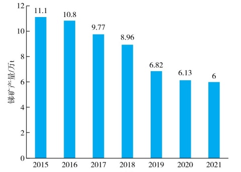 我國一直是世界最大的銻生產(chǎn)國,占世界總銻生產(chǎn)量的80%以上。2018-2020年銻價(jià)格低迷導(dǎo)致高成本礦山產(chǎn)能退出,此外由于國內(nèi)礦山資源枯竭及環(huán)保治理,海外也有部分銻礦山資源枯竭,造成銻礦供應(yīng)量由2020年的15.3萬t降低至2021年的11.1萬t,形成銻產(chǎn)業(yè)供需失衡。