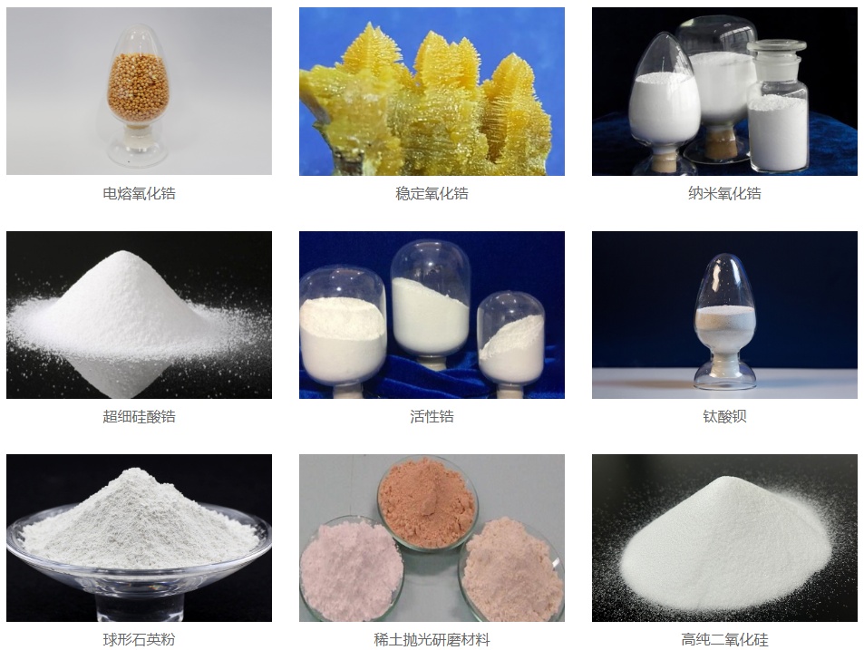 應(yīng)用材料產(chǎn)品主要圍繞鋯、硅、鈦三種元素,立足鋯系產(chǎn)品,如電熔氧化鋯、硅酸鋯、穩(wěn)定鋯等,在此基礎(chǔ)上擴大產(chǎn)品系列,如球形石英粉、高純合成二氧化硅、納米鈦酸鋇、稀土拋光粉等產(chǎn)品。