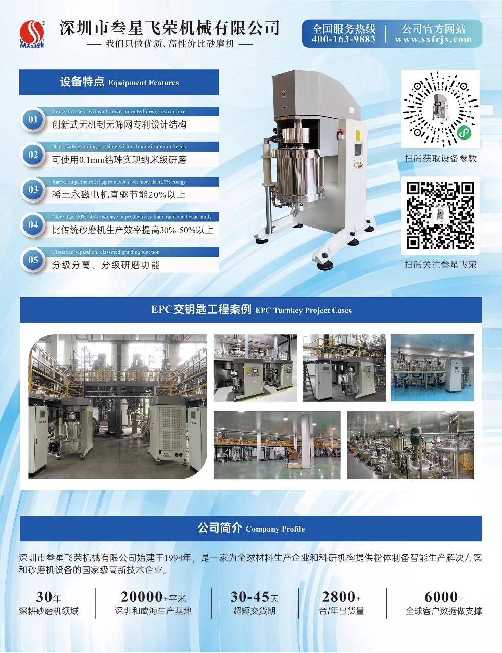 深圳市叁星飛榮機械有限公司始建于1994年,是一家為全球材料生產(chǎn)企業(yè)和科研機構提供粉體制備智能生產(chǎn)解決方案和砂磨機設備的國家級高新技術企業(yè)。