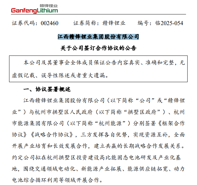 中國粉體網訊 4月26日,江西贛鋒鋰業集團股份有限公司(簡稱:贛鋒鋰業)發布公告稱,公司與杭州市拱墅區人民政府(簡稱:拱墅區政府)、杭州市能源集團有限公司(簡稱:杭州能源)分別簽署《框架合作協議》《戰略合作協議》,約定公司擬在杭州拱墅區投資建設高比能固態電池研發及產業化基地,圍繞交通領域電動化、新能源產業拓展、能源供應鏈拓寬、動力電池綜合循環利用等領域開展合作。