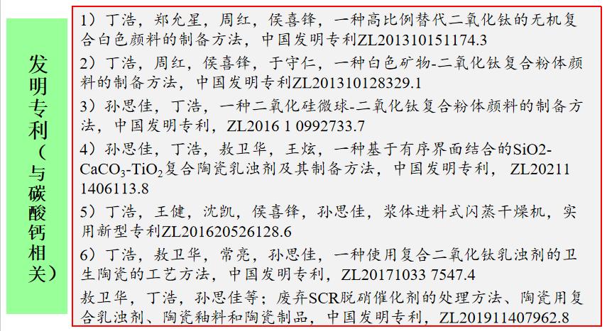 我們開發了CaCO3-TiO2和CaCO3-SiO2-TiO2復合顏料、CaCO3-TiO2和CaCO3-SiO2-TiO2復合陶瓷乳濁劑、CaCO3表面負載納米TiO2和CdS復合光催化劑、CaCO3/Al(OH)3復合材料、CaCO3負載ZnO及其改性超疏水涂層的制備與抗菌性能,開發的CaCO3@SiO2復合材料用在橡膠和塑料中大大節約白炭黑的用量,其中部分成果已實現了產業化。