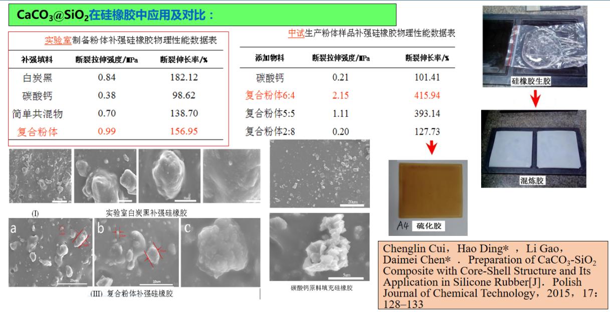 此外,碳酸鈣,尤其是納米碳酸鈣在橡膠材料里具有廣泛的應用,但是碳酸鈣和高分子機體相容性差。我們課題組發明了二氧化硅包覆碳酸鈣材料,大大提高了碳酸鈣和有機物相容性,在橡膠、塑料中應用其拉伸強度、斷裂伸長率等力學性能,包括一些熱學性能得到有效提高,大大節約了白炭黑用量。