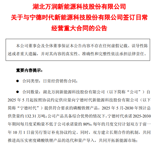 中國(guó)粉體網(wǎng)訊 5月20日,萬(wàn)潤(rùn)新能公告稱,公司與寧德時(shí)代簽訂《業(yè)務(wù)合作協(xié)議》,自2025年5月1日至2030年5月1日,預(yù)計(jì)向?qū)幍聲r(shí)代供應(yīng)磷酸鐵鋰產(chǎn)品約132.31萬(wàn)噸,協(xié)議期限為5年。