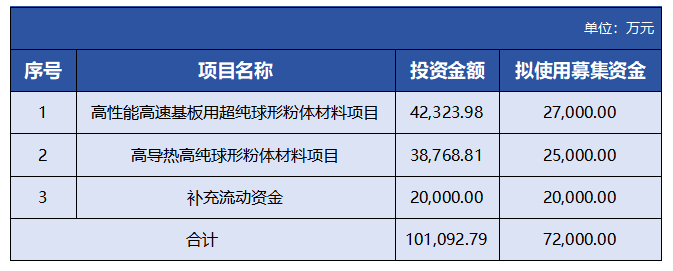 中國粉體網(wǎng)訊 近日,聯(lián)瑞新材發(fā)布公告稱,公司擬向不特定對(duì)象發(fā)行可轉(zhuǎn)換公司債券募集資金總額不超過72,000萬元,募集資金凈額將用于高性能高速基板用超純球形粉體材料項(xiàng)目、高導(dǎo)熱高純球形粉體材料項(xiàng)目和補(bǔ)充流動(dòng)資金。
