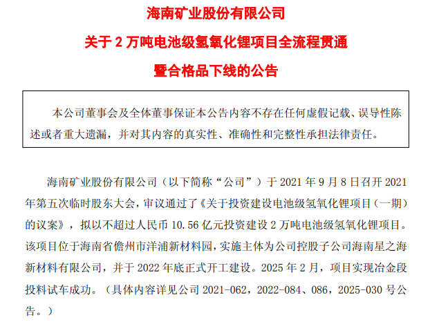 據悉,海南礦業于2021年9月8日召開2021年第五次臨時股東大會,審議通過了《關于投資建設電池級氫氧化鋰項目(一期)的議案》,擬以不超過人民幣10.56億元投資建設2萬噸電池級氫氧化鋰項目。該項目位于海南省儋州市洋浦新材料園,實施主體為公司控股子公司海南星之海新材料有限公司,并于2022年底正式開工建設。2025年2月,項目實現冶金段投料試車成功。