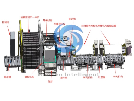 全自動(dòng)噸袋疊包整形一體機(jī)可與抽真空機(jī)、穿箭打包機(jī)、纏膜機(jī)等銜接,自動(dòng)完成
