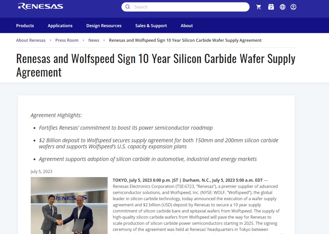 2023年,瑞薩電子與Wolfspeed 簽署了為期10年的SiC晶圓供應協議,并支付了20億美元預付款。