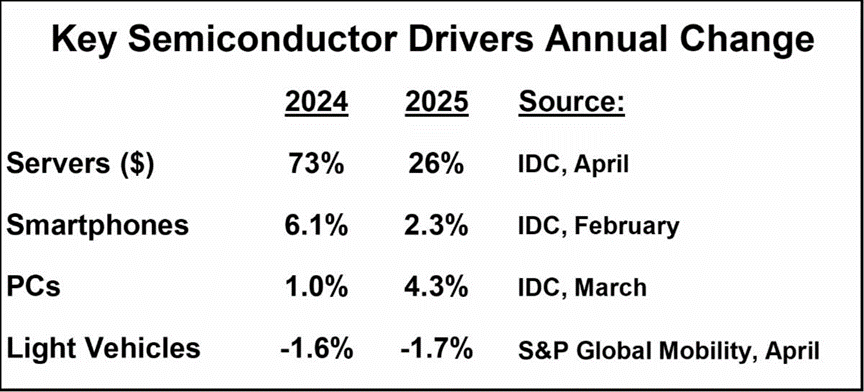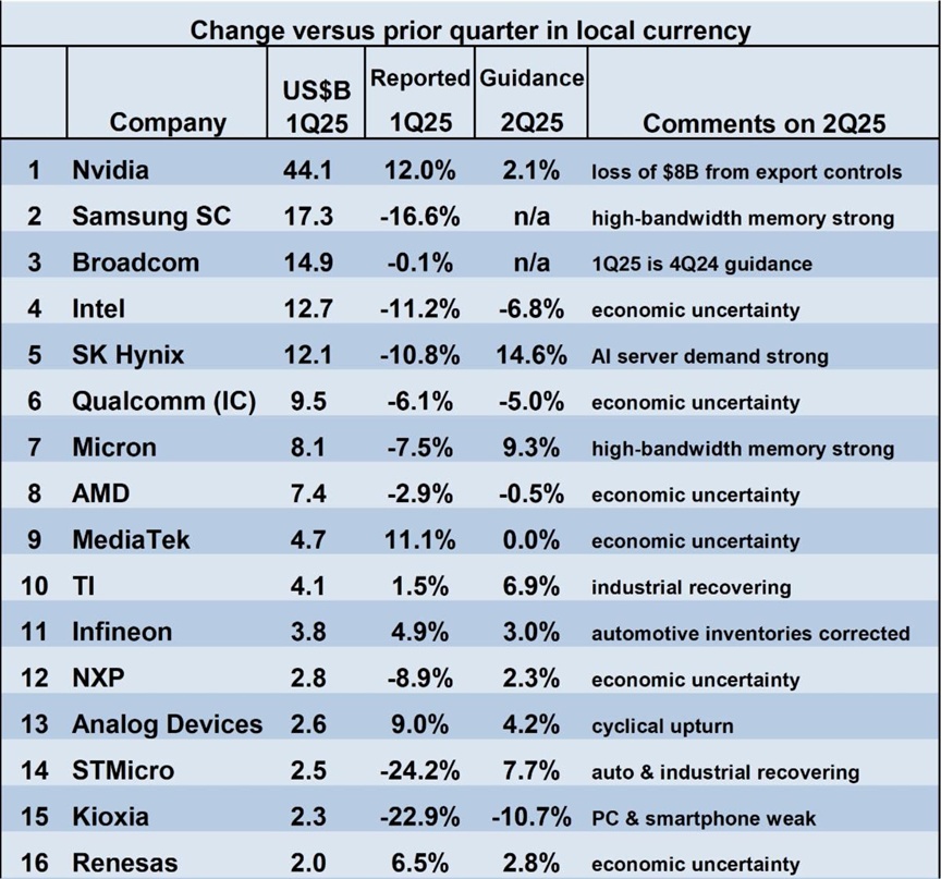 大多數公司都將關稅帶來的經濟不確定列為其前景的一個因素。依賴汽車和工業市場的公司正在復蘇,強勁的人工智能需求正在推動英偉達和內存公司的增長。