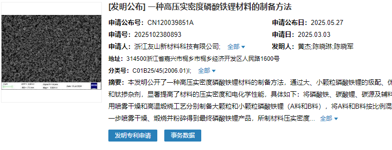 在此背景下,5月27日,華友集團旗下浙江友山新材料科技有限公司公開了一項《一種高壓實密度磷酸鐵鋰材料的制備方法》的專利。