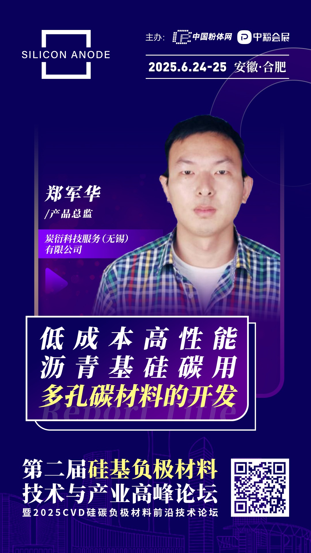針對各類負極材料的產業化技術與國內外市場狀況,中國粉體網將于2025年6月24-25日在安徽·合肥舉辦第二屆硅基負極材料技術與產業高峰論壇暨2025CVD硅碳負極材料前沿技術論壇。旨在為負極材料產業鏈上中下游企業搭建深度交流的平臺,開展產、學、研合作,助推負極材料行業持續健康發展。屆時,炭衍科技服務(無錫)有限公司產品總監鄭軍華將作題為《低成本高性能瀝青基硅碳用多孔碳材料的開發》的報告。