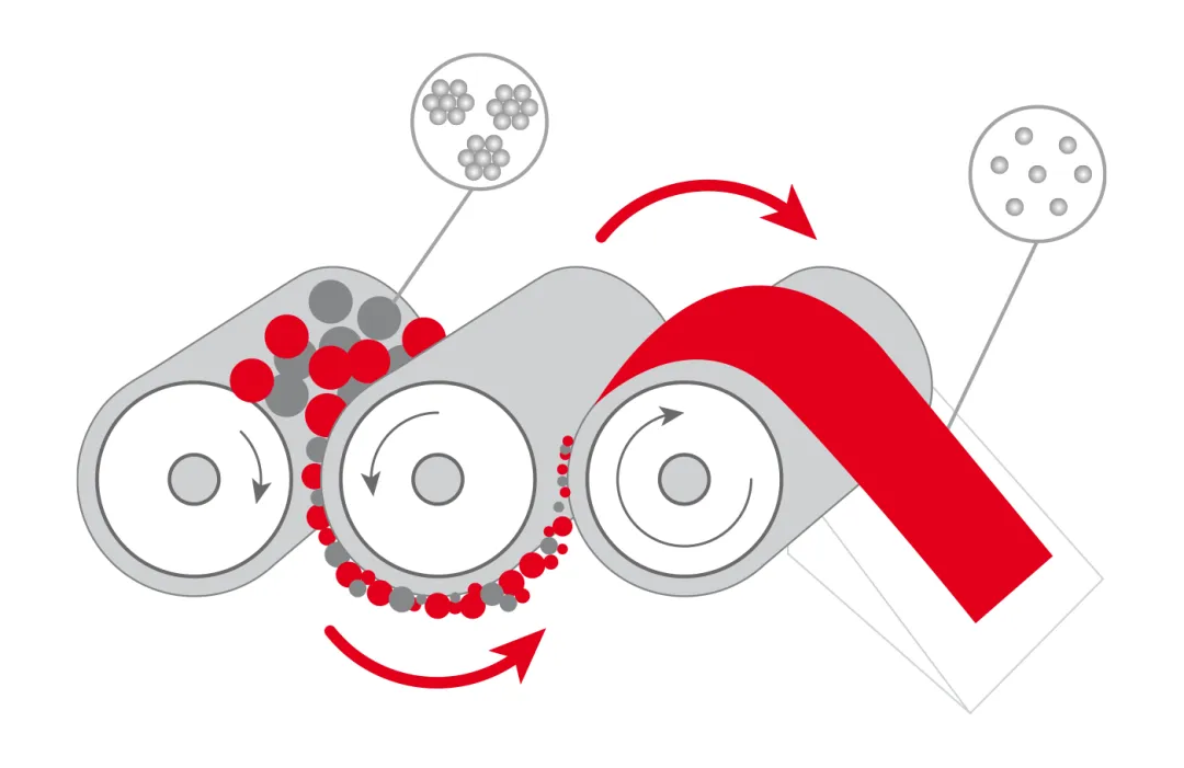 中毅ZYE的三輥研磨機是精密型三輥機,作為中高粘度材料最有效的分散設備,既可以實現亞微米級的精細分散,又能達到最佳的粒徑集中度。廣泛應用于油漆、油墨、顏料、塑料等漿料的制造生產中,其核心原理是通過水平的三根輥筒表面互相擠壓,不同轉向及速度差所產生的剪切力而達到研磨分散的效果,且在ZYE三輥機精密的間距控制下能夠做到不破壞材料的表面形貌而達到解聚的目的。