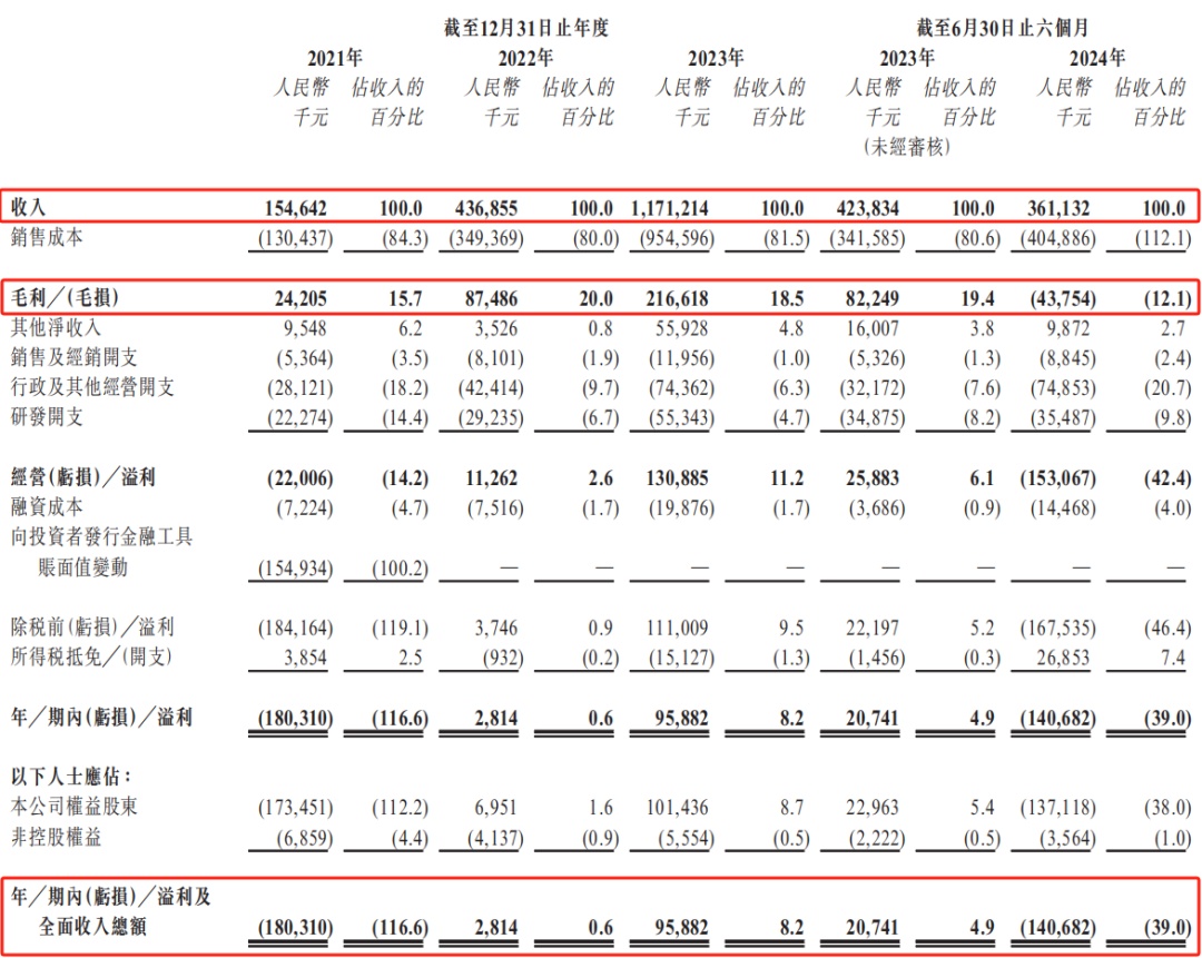 在營收方面,2021-2023年營收從1.55億元躍升至11.71億元,年復合增長率175.2%;但2024年上半年營收3.61億元,同比下降14.9%。對于2024年業績上的下滑,招股書中的理由是海外銷量的減少以及受到了國際貿易政策的影響。