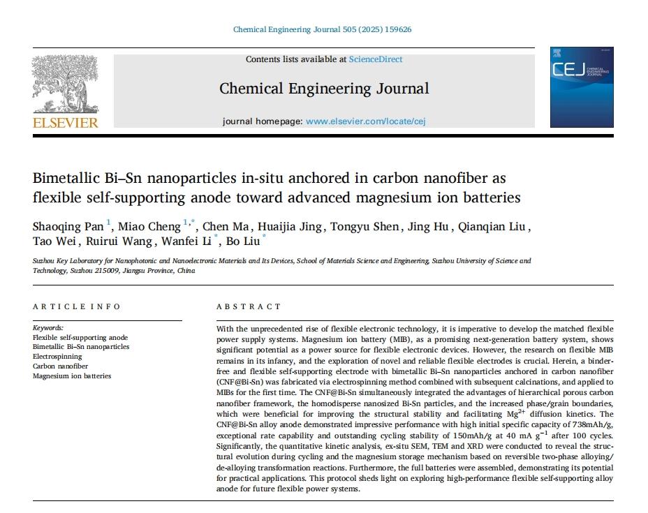 中國粉體網(wǎng)訊 近日,蘇州科技大學劉波教授課題組通過靜電紡絲法結(jié)合原位熱還原工藝,制備了一種無粘結(jié)劑且柔性的自支撐電極,該電極由雙金屬Bi-Sn納米顆粒錨定在碳納米纖維(CNF@Bi-Sn)中構(gòu)成,并首次應(yīng)用于鎂離子電池。