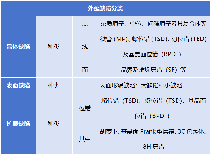 外延層的缺陷種類非常多,形成機制也很復雜,總體上可以分成三大類:晶體缺陷、表面形貌缺陷以及擴展缺陷。
