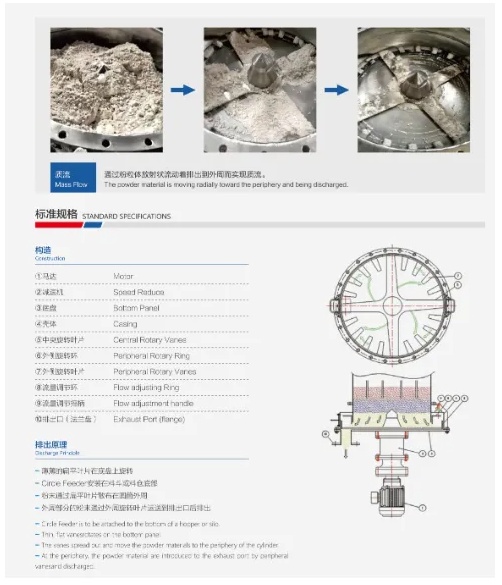卸料盤根據(jù)物料流動特性,可采用30、40、45、55不同錐度,適用于各種粉料和糖料;