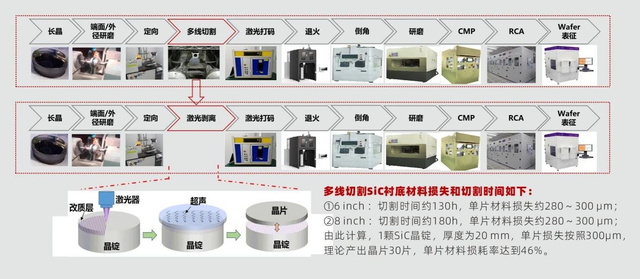 激光剝離技術(shù)是將激光精密加工技術(shù)與晶體剝離技術(shù)相結(jié)合,預(yù)先在晶體內(nèi)特定位置制造結(jié)合力較薄弱的改質(zhì)層,有利于剝離工藝中形成確定的晶體斷裂位置,從而提升了剝離過程的可控性與晶片的厚度一致性,這對(duì)于SiC等高硬度、高脆性、高材料成本的單晶材料加工尤為重要。與多線切割相比,激光剝離技術(shù)更適合材料成本高、晶錠長度短的硬脆晶體加工領(lǐng)域,實(shí)現(xiàn)晶體加工成本的大幅下降,并提高加工效率與加工質(zhì)量。