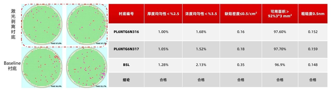外延驗(yàn)證:在有效利用面積、均勻性、缺陷密度、表面粗糙度等關(guān)鍵參數(shù)上,與基準(zhǔn)襯底(Baseline)整體相當(dāng),部分指標(biāo)甚至略優(yōu)。