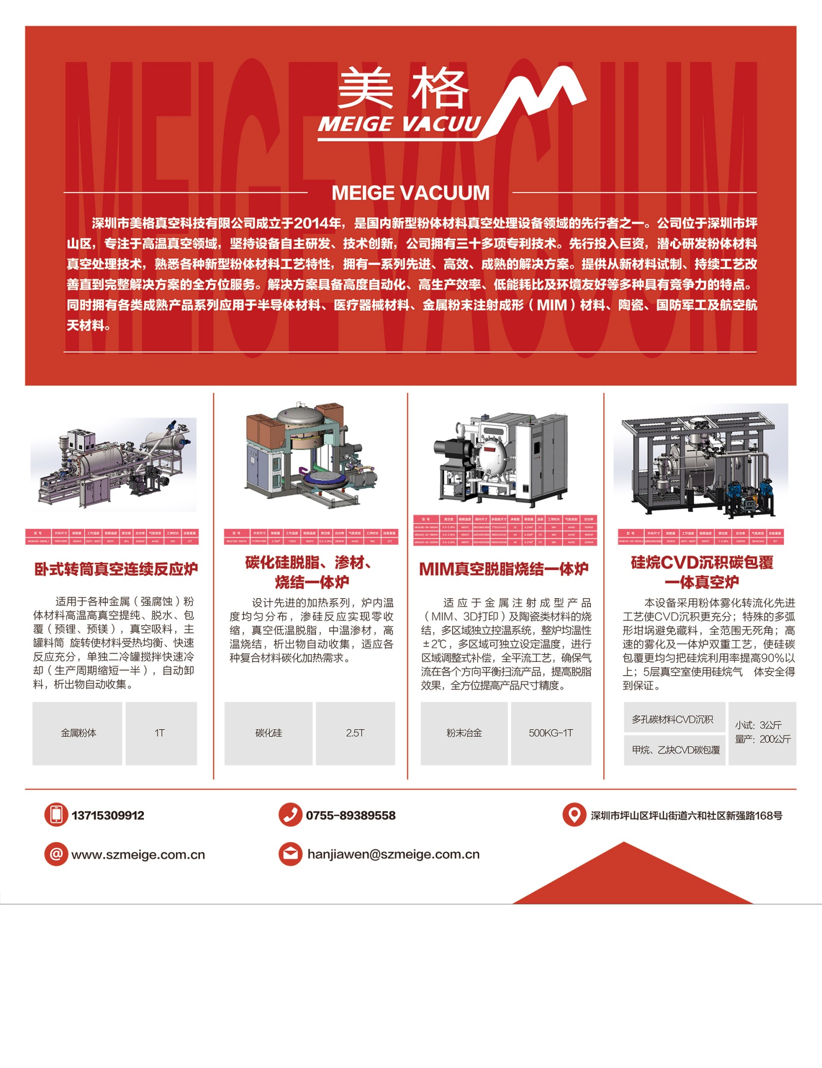 深圳市美格真空科技有限公司成立于2014年,是國內新型新能源材料真空處理設備領域的先行者之一。公司位于深圳市坪山區,專注于高溫真空領域,堅持設備自主研發、技術創新,公司擁有三十多項專利技術。先行投入巨資,潛心研發新型新能源材料真空處理技術,熟悉各種新型新能源材料工藝特性,擁有一系列先進、高效、成熟的解決方案。提供從新材料試制、持續工藝改善直到完整解決方案的全方位服務。解決方案具備高度自動化、高生產效率、低能耗比及環境友好等多種具有競爭力的特點。同時擁有各類成熟產品系列應用于半導體材料、醫療器械材料、金屬粉末注射成形(MIM)材料、陶瓷、國防軍工及航空航天材料。