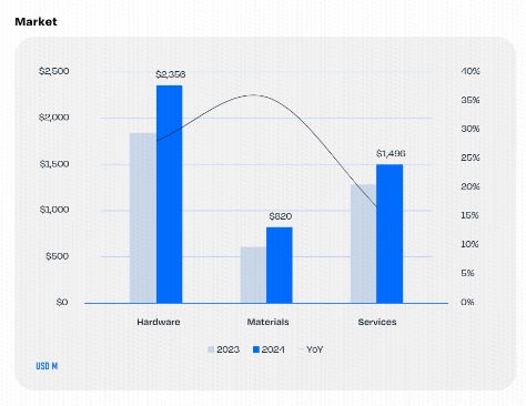 在全球金屬增材制造市場(chǎng)的強(qiáng)勁增長(zhǎng)勢(shì)頭當(dāng)中,據(jù)悉材料市場(chǎng)增速最快,受鈦合金等高價(jià)值金屬需求激增推動(dòng),同比增長(zhǎng)35.6%。