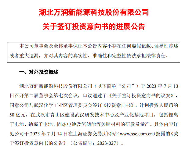 中國(guó)粉體網(wǎng)訊 7月14日晚,萬(wàn)潤(rùn)新能發(fā)布公告,公司與武漢化學(xué)工業(yè)區(qū)管理委員會(huì)于2023年7月簽訂《投資意向書(shū)》,計(jì)劃投資人民幣約50億元,在武漢市青山區(qū)建設(shè)武漢研發(fā)技術(shù)中心及產(chǎn)業(yè)化基地項(xiàng)目,包括鋰離子電池、鈉離子電池、固態(tài)電池及氫儲(chǔ)能等關(guān)鍵材料的研發(fā)及量產(chǎn)。