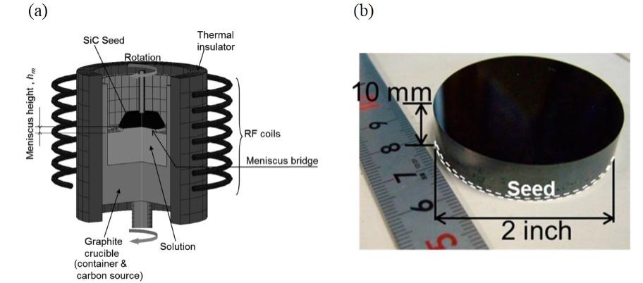 (a)液相法生長SiC晶體示意圖;(b)液相法生長的SiC晶體