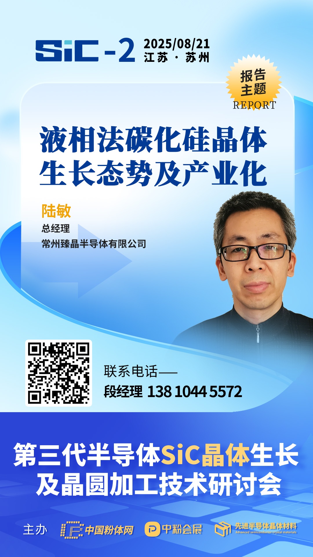 2025年8月21日,中國粉體網將在蘇州舉辦第三代半導體SiC晶體生長及晶圓加工技術研討會。屆時,來自常州臻晶半導體有限公司總經理陸敏將帶來《液相法碳化硅晶體生長態勢及產業化》的報告,報告中將介紹液相法技術進展,包括摻雜調控、缺陷控制、晶體長厚等,并分享臻晶半導體在液相法單晶爐及其碳化硅長晶工藝技術等研究最新成果,同時探討液相法產業化關鍵問題及對策,并展望液相法未來發展前景。
