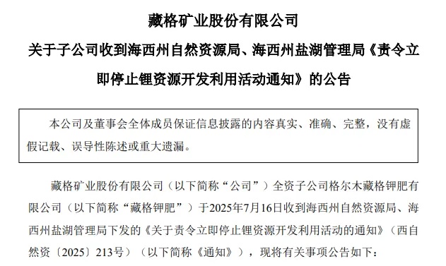 中國(guó)粉體網(wǎng)訊 7月17日午間,藏格礦業(yè)發(fā)布公告稱(chēng),其全資子公司格爾木藏格鉀肥有限公司于7月16日接收到海西州自然資源局及海西州鹽湖管理局聯(lián)合下發(fā)的監(jiān)管通知。該通知明確要求企業(yè)立即終止違規(guī)的鋰資源開(kāi)發(fā)利用行為。