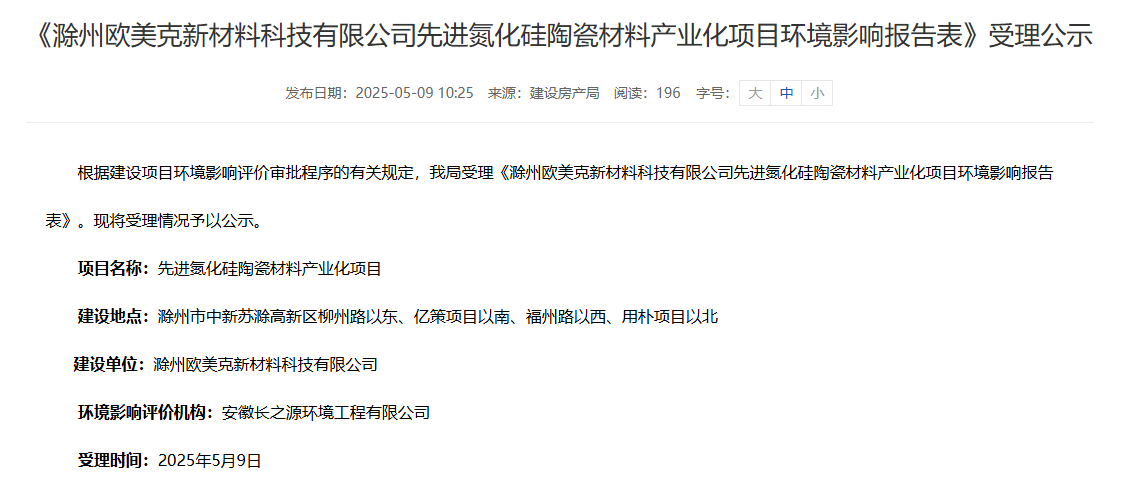 滁州歐美克新材料科技有限公司氮化硅陶瓷項目獲批