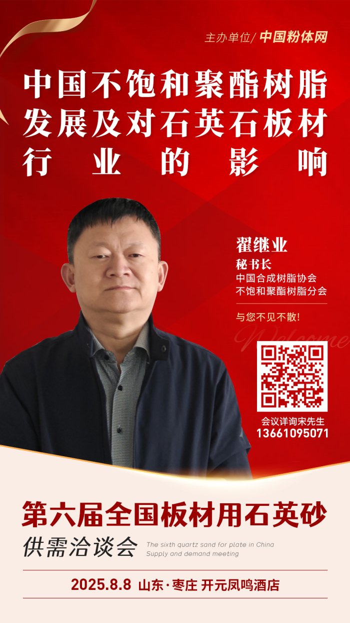 2025年8月8日,由中國粉體網主辦的第六屆全國板材用石英砂供需洽談會即將在山東棗莊召開,中國合成樹脂協會不飽和聚酯樹脂分會秘書長翟繼業將做《中國不飽和聚酯樹脂發展及對石英石板材行業的影響》的報告,屆時,他將對中國不飽和聚酯樹脂發展及對石英石板材行業的影響等問題進行詳細解讀。