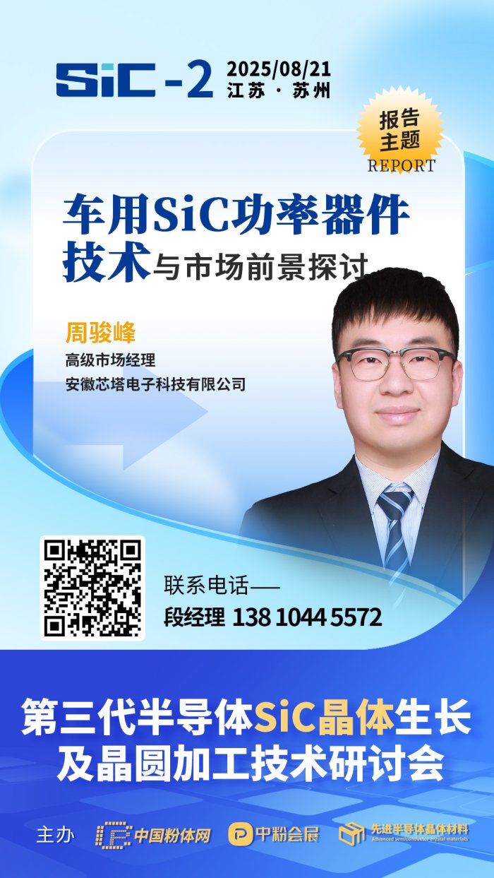 2025年8月21日,中國粉體網將在蘇州舉辦第三代半導體SiC晶體生長及晶圓加工技術研討會。屆時,來自安徽芯塔電子科技有限公司高級市場經理周駿峰將帶來《車用SiC功率器件技術與市場前景探討》的報告。