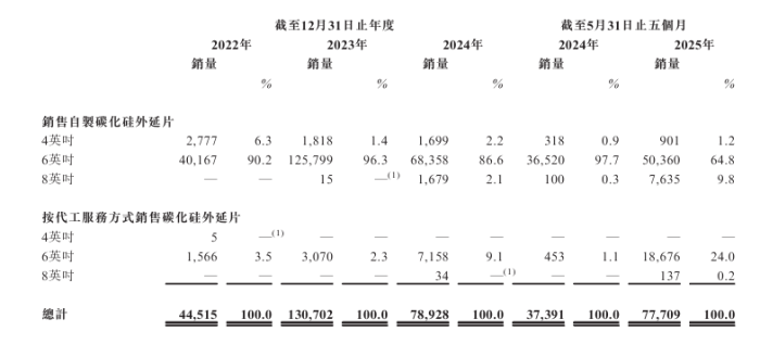 在碳化硅外延片銷售上,2022年-2025年前五個(gè)月,天域半導(dǎo)體的碳化硅外延片銷量(包括自制外延片及按代工服務(wù)方式銷售的外延片)分別約為4.5萬(wàn)片、13.1萬(wàn)片、7.9萬(wàn)片、7.8萬(wàn)片。